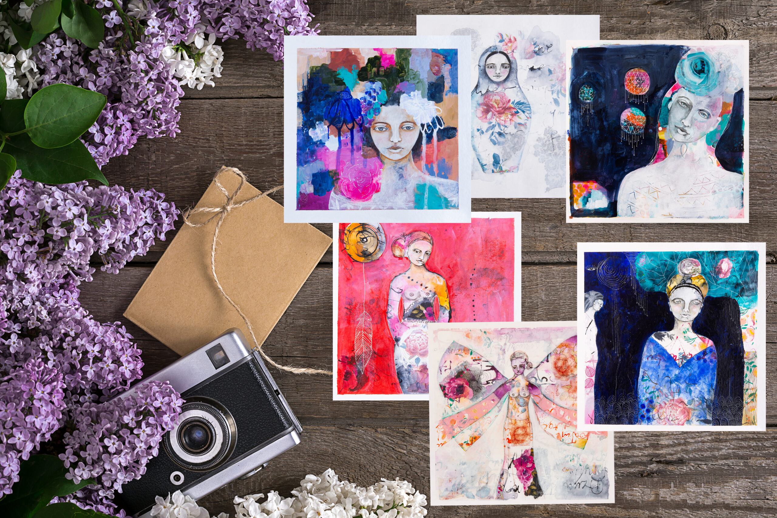 Kobiety zestaw pocztówek artystycznych, 6 kart pocztowych z wizerunkami kobiet, 14,5 cm na 14,5 cm, mini wydruki