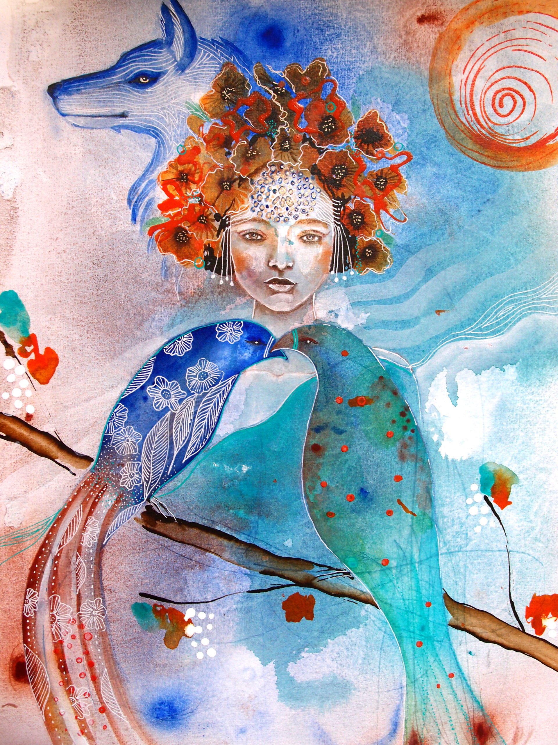 Obraz Ptasia Bogini został namalowany techniką mieszaną na papierze do akwareli