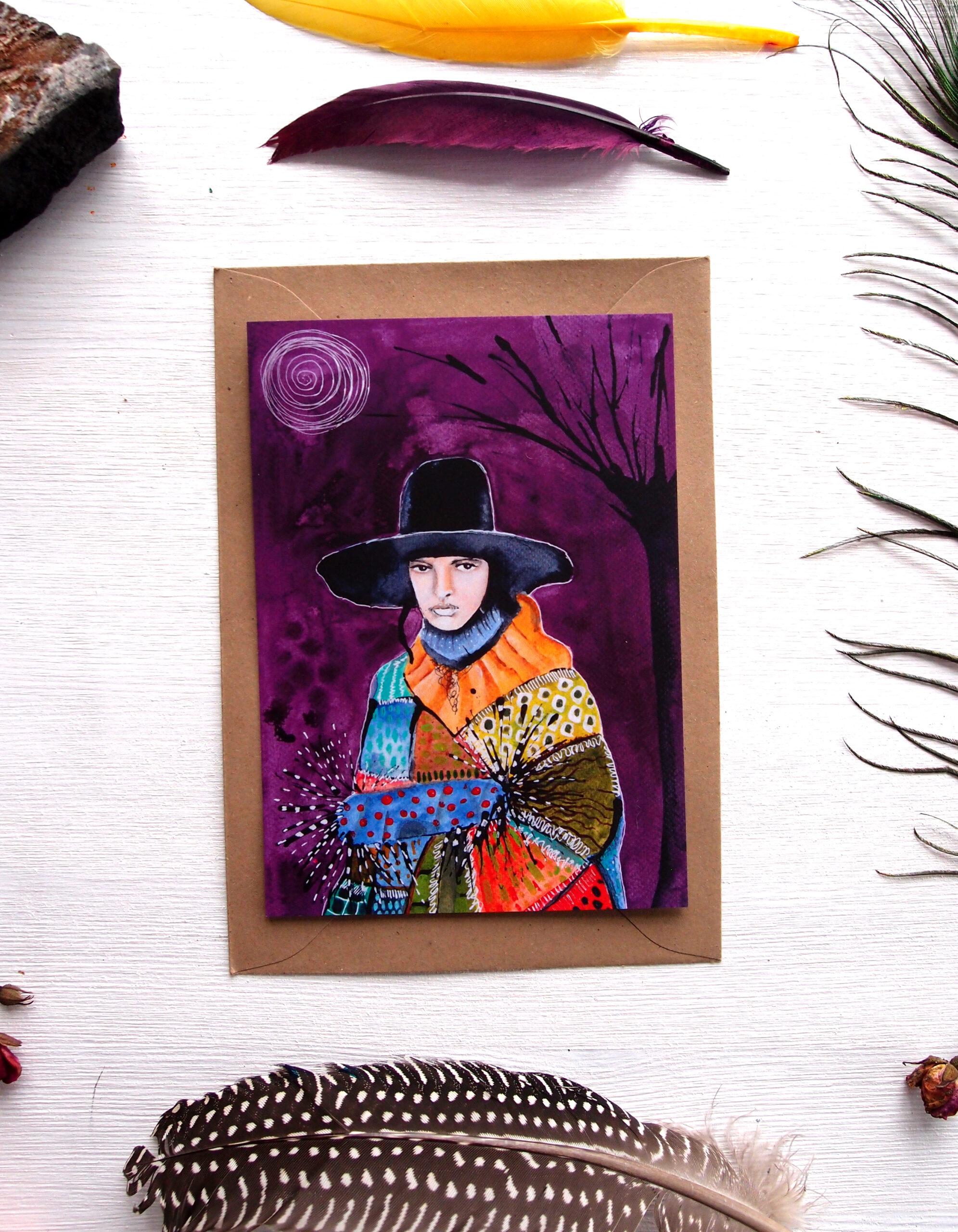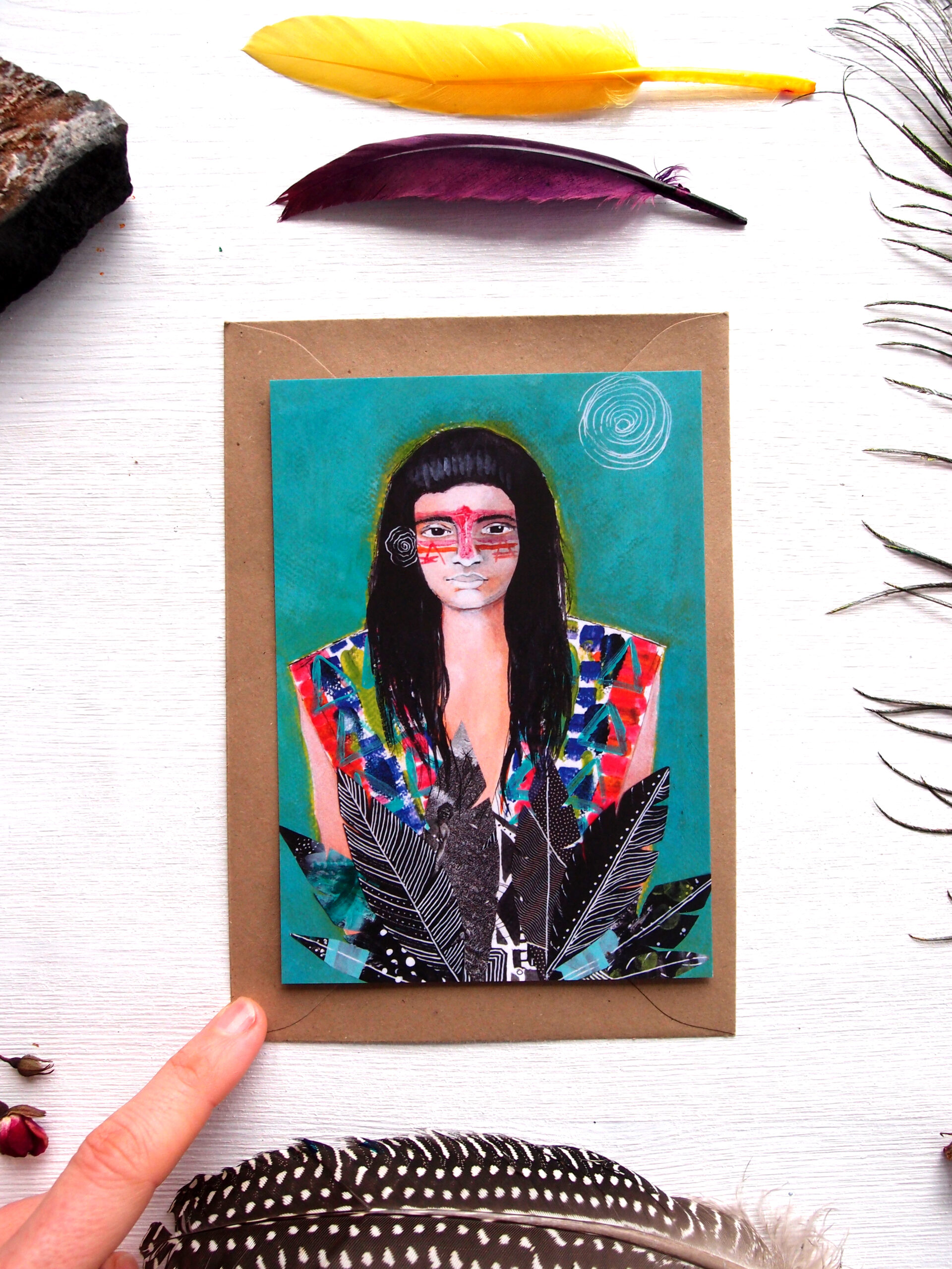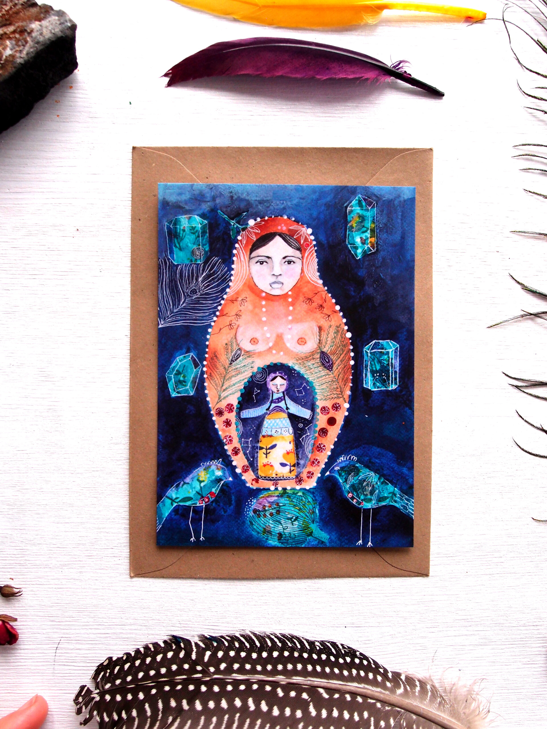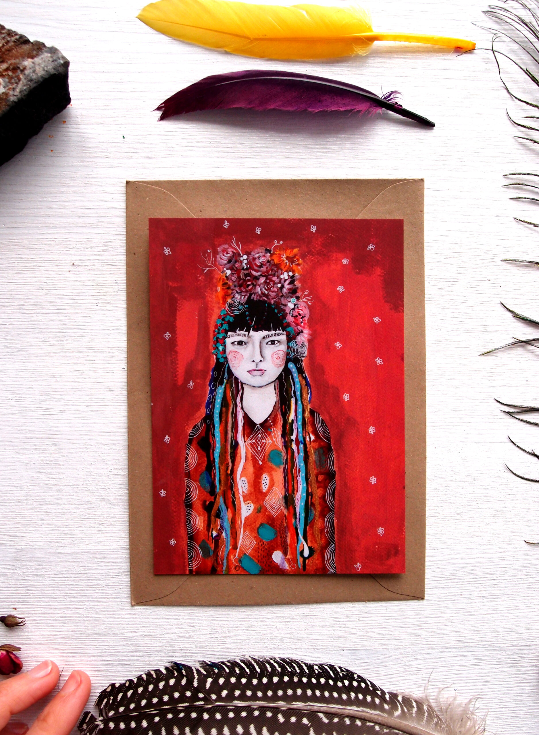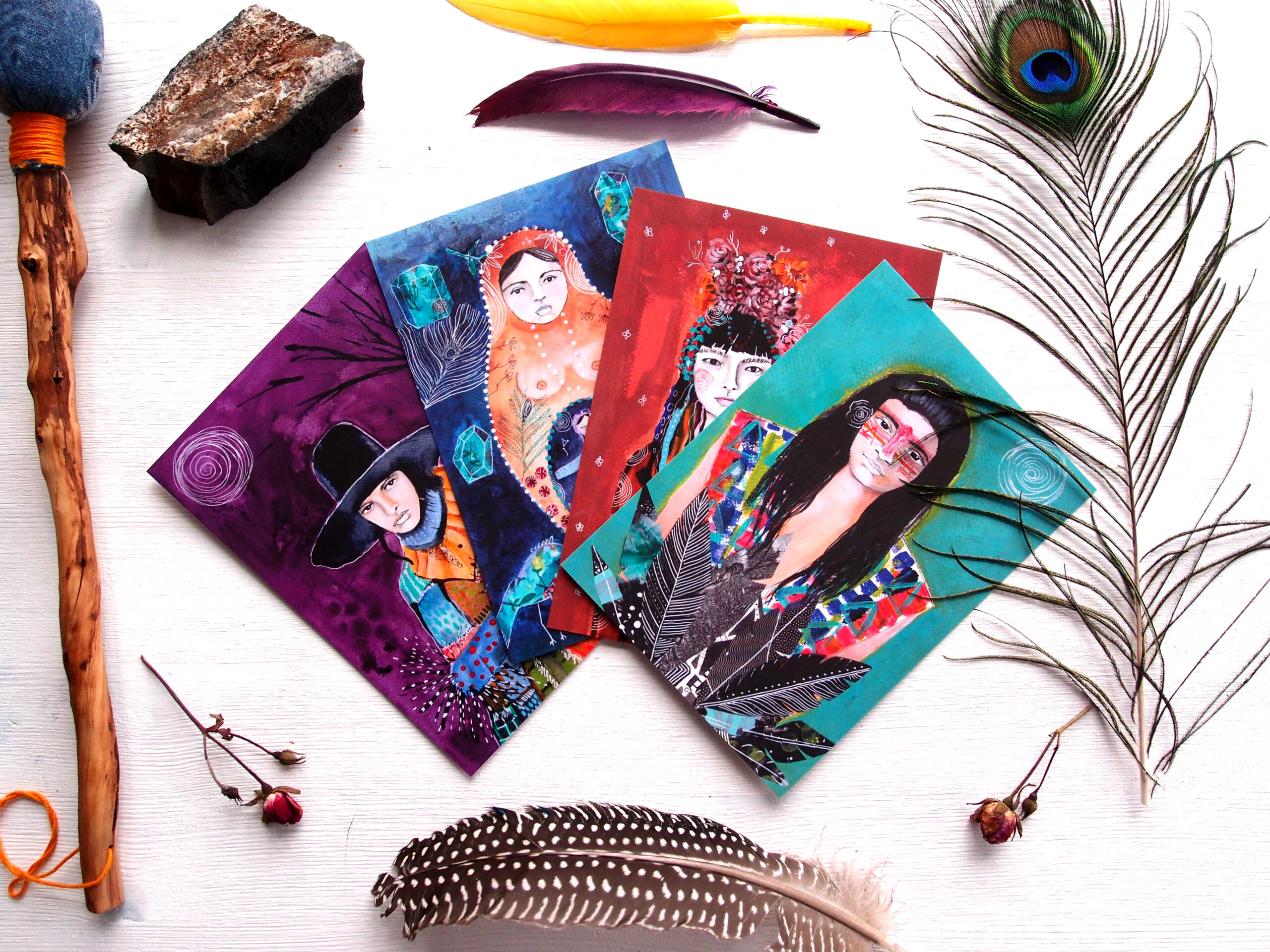 Mamy indiankę na turkusowym tle, dziewczynę z kwiatową koroną, uzdrawiającą matrioszkę oraz Marię-kobiete portugalską. Wszystkie zostały oryginalnie namalowane przeze mnie i na podstawie tych prac powstała mała bardzo limitowana kolekcja pocztówek.