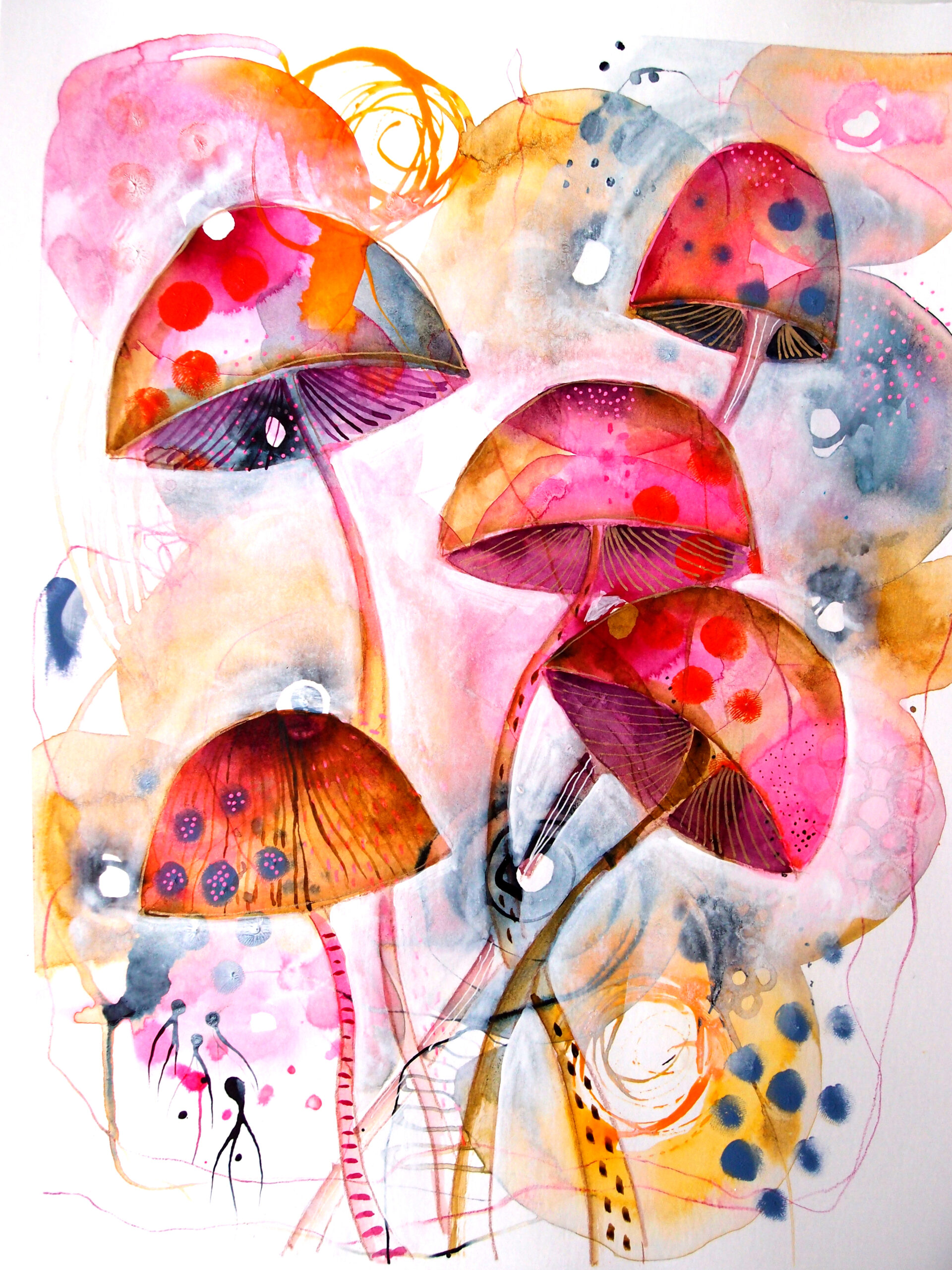 Magiczne grzyby, podróż malarska nagranie, to 77 minutowe doświadczenie twórcze, podczas którego za pomocą tuszy akrylowych i innych materiałów, przywołasz magiczne grzyby.