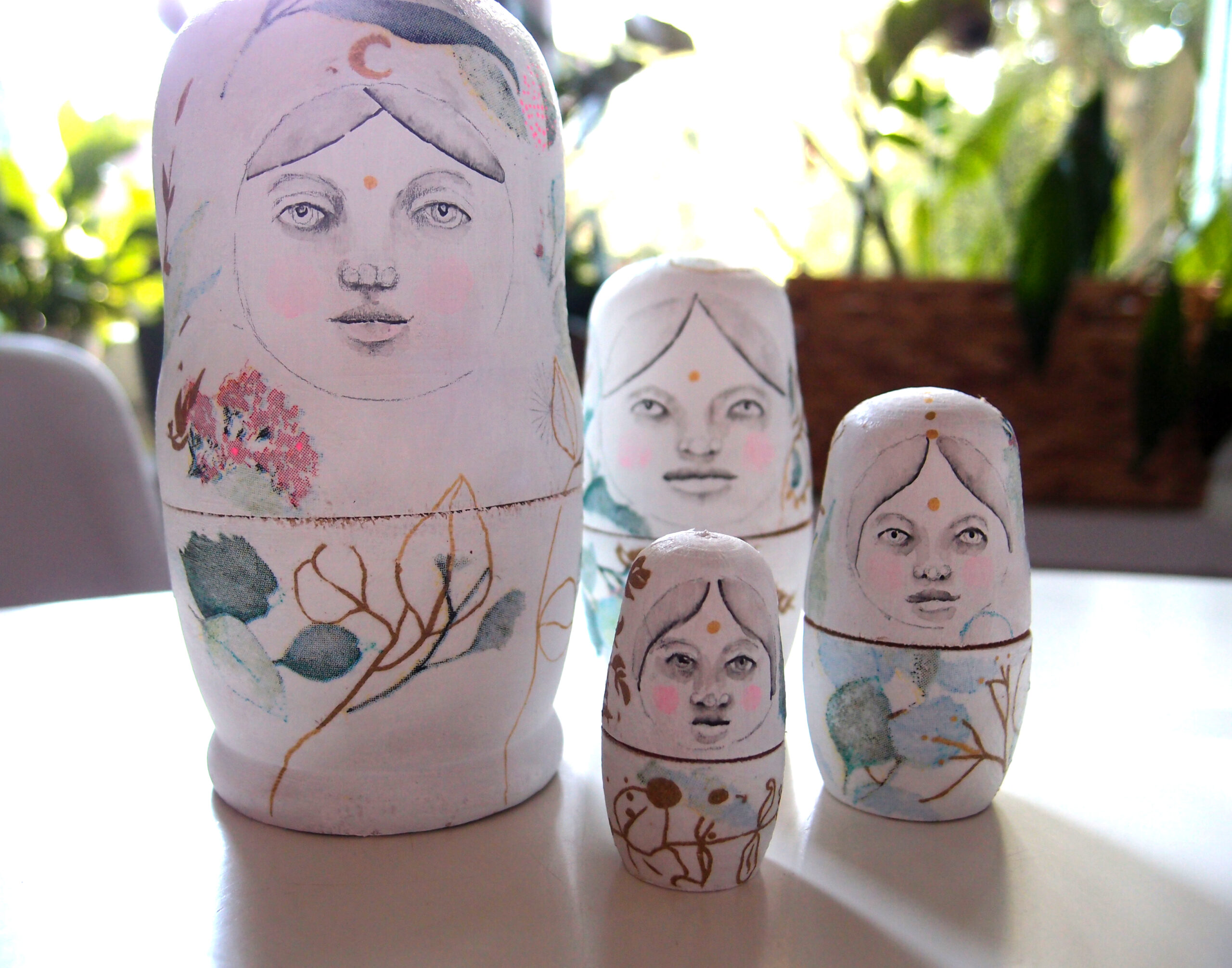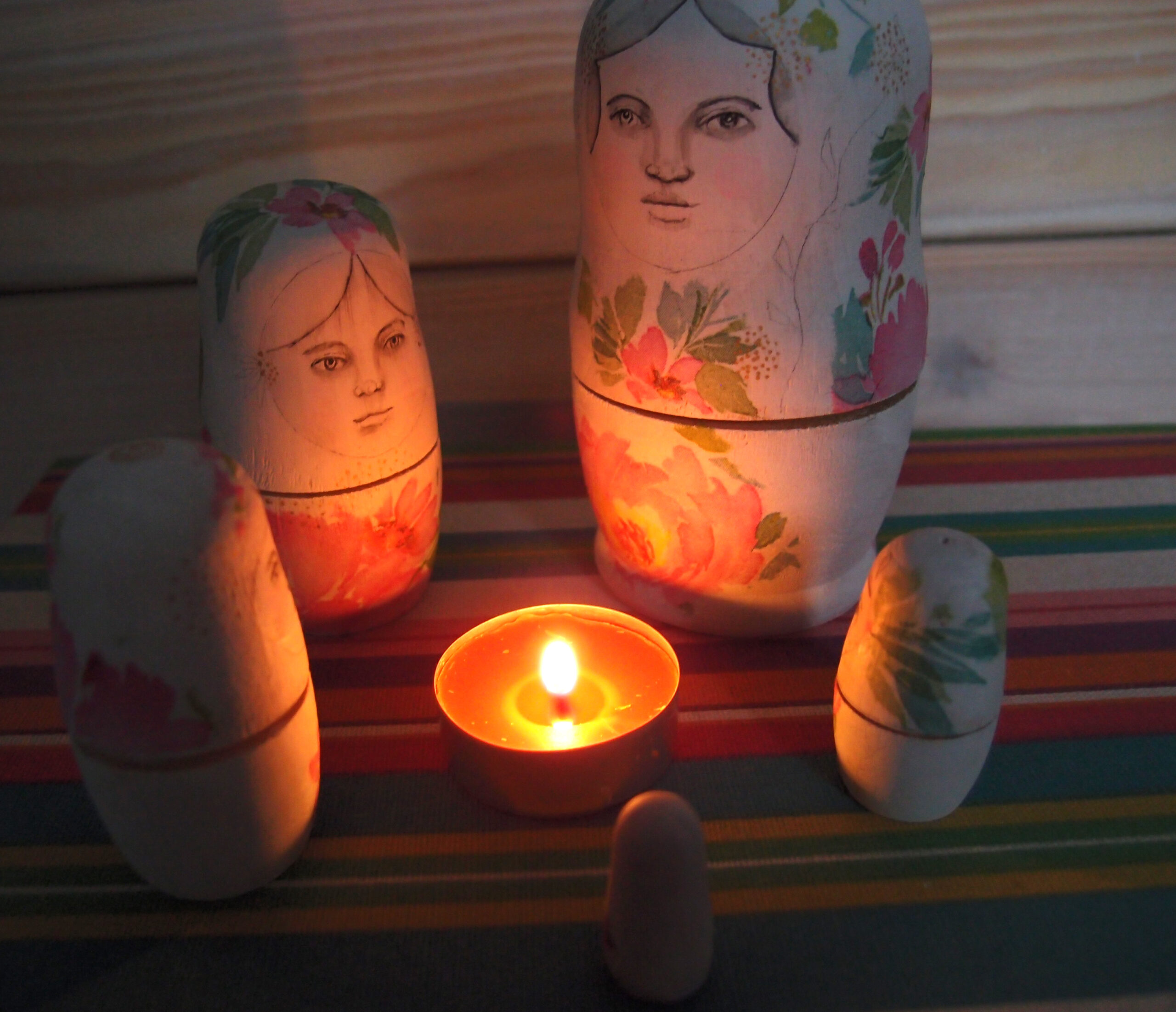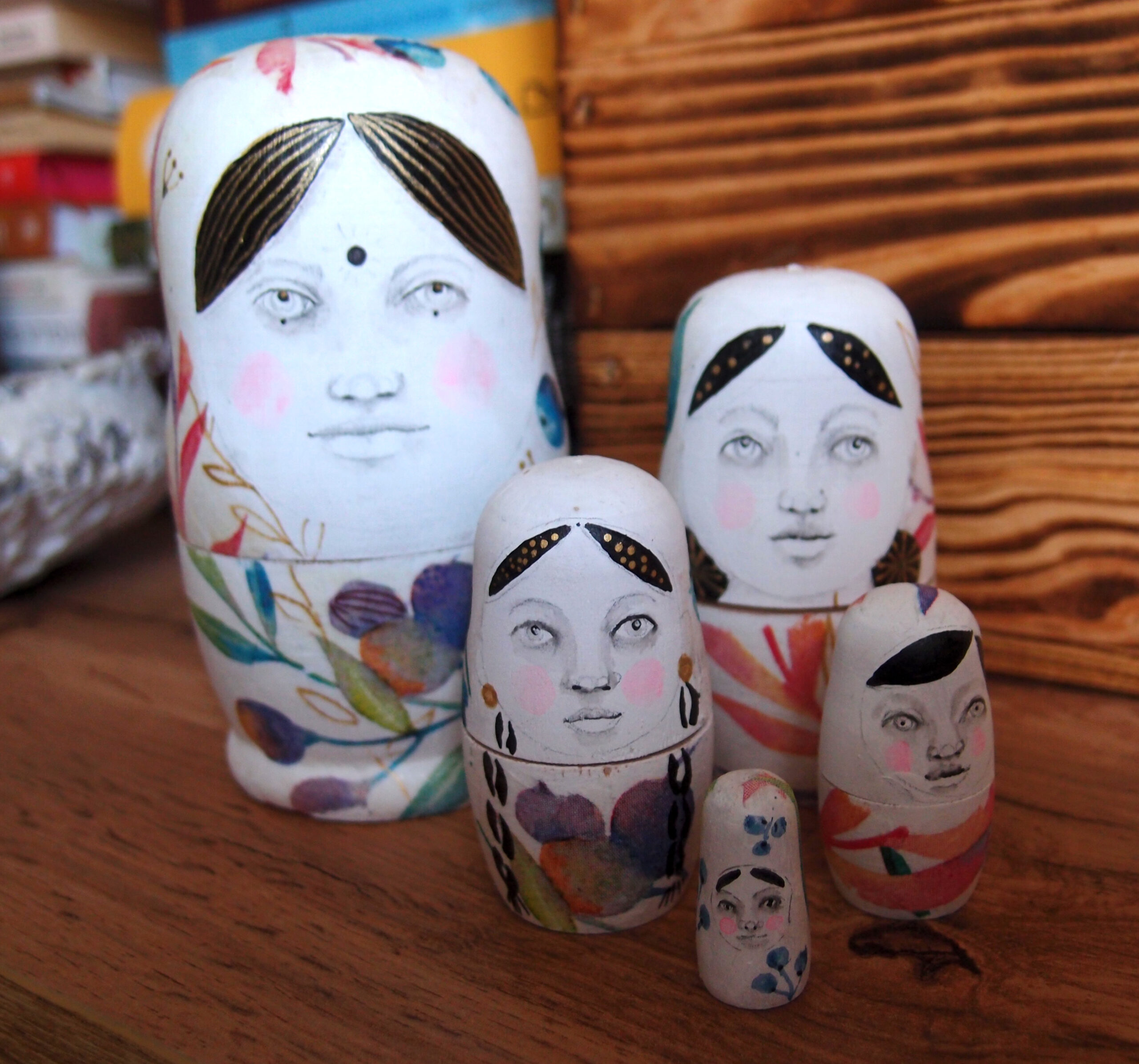 5 matrioszek ręcznie malowanych, zdobionych, zawerniksowanych, stworzonych z intencją dla trzymania przestrzeni