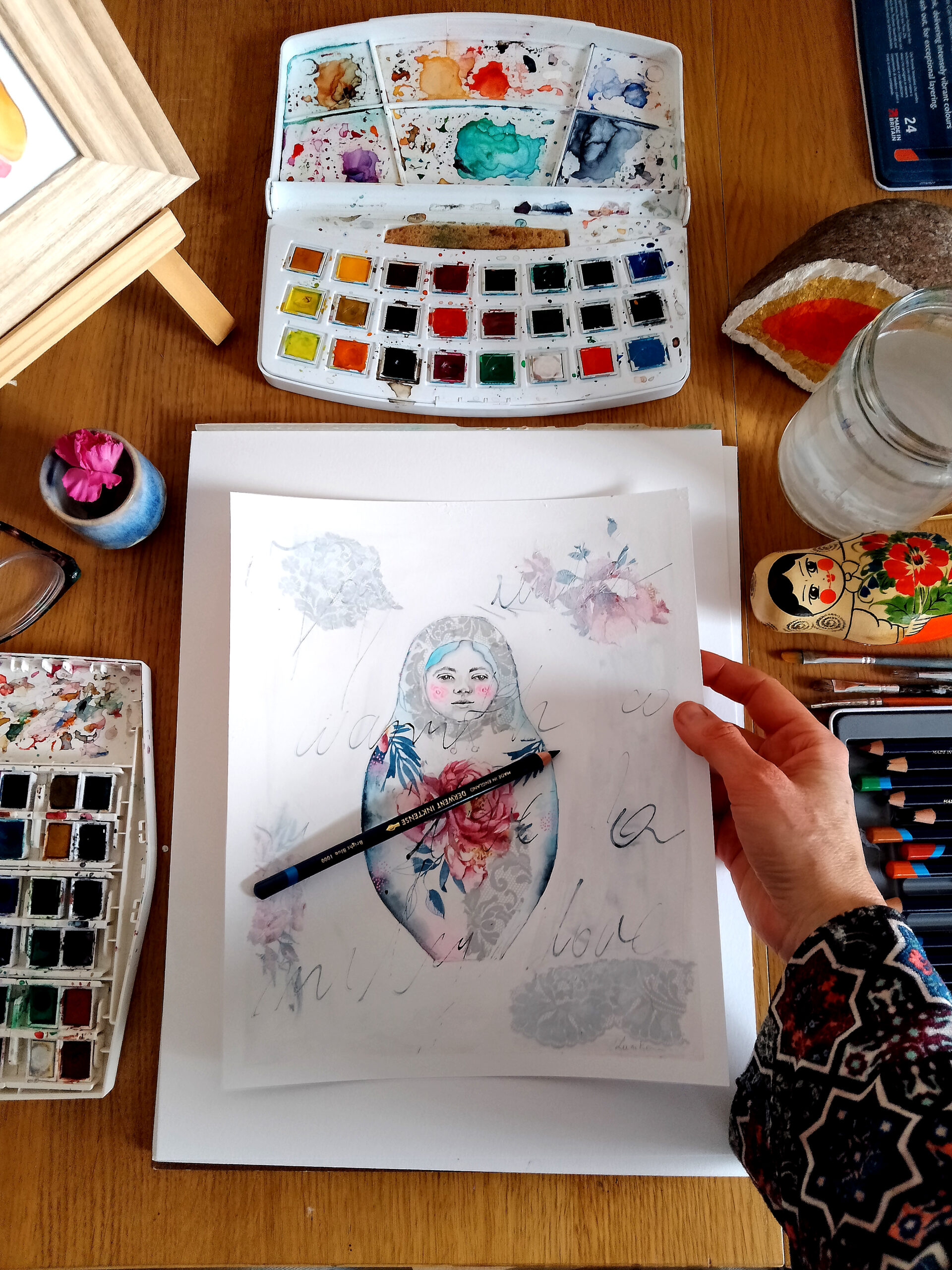 Matrioszki maluję techniką mieszaną, na papierze.
